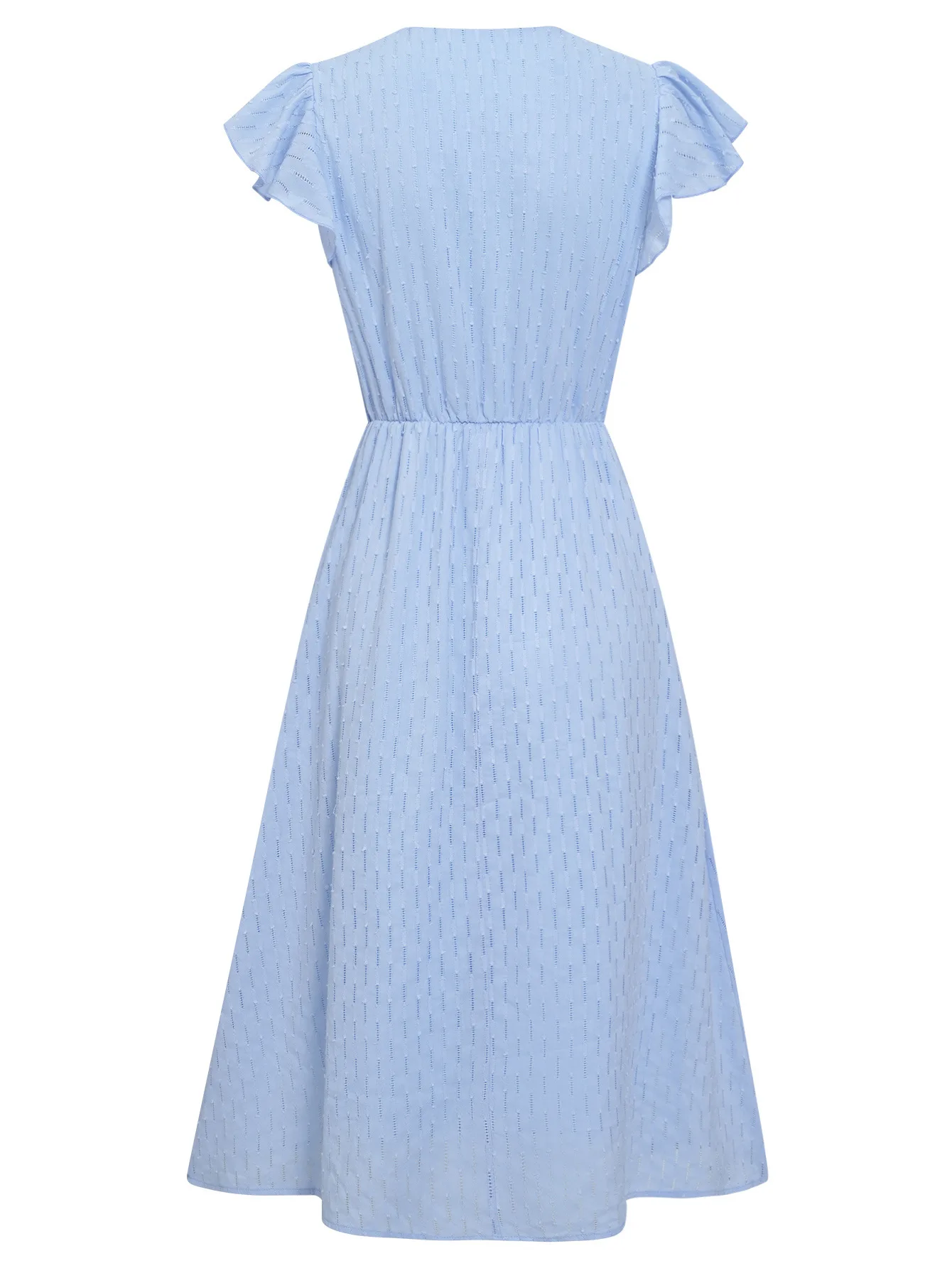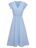 Sa coupe A-line donne une allure féminine et décontractée, tandis que le col en V apporte une touche chic. La robe est dotée de manches courtes et volantées sur les épaules.
