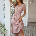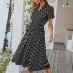 Confectionnée en fibre synthétique de haute qualité, cette robe bohème mi-longue offre une sensation légère et fluide grâce à son tissu en viscose. La coupe loose et la longueur mi-mollet apportent une touche décontractée tout en offrant une silhouette féminine. La taille marquée, le col en V, les motifs à pois et les boutons de chemises habillent cette robe mi longue au style bohème.