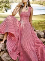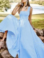Fabriquée en fibre synthétique de haute qualité, cette longue robe bohème tombante offre un confort exceptionnel tout en restant légère et aérée, parfaite pour les journées chaudes de l’été. Le col carré et la taille empire accentuent la féminité de la silhouette, tandis que la fermeture à glissière latérale permet un enfilage facile et une coupe ajustée. La robe présente un motif rayé intemporel et des bretelles épaisses, laissant vos épaules nues.
